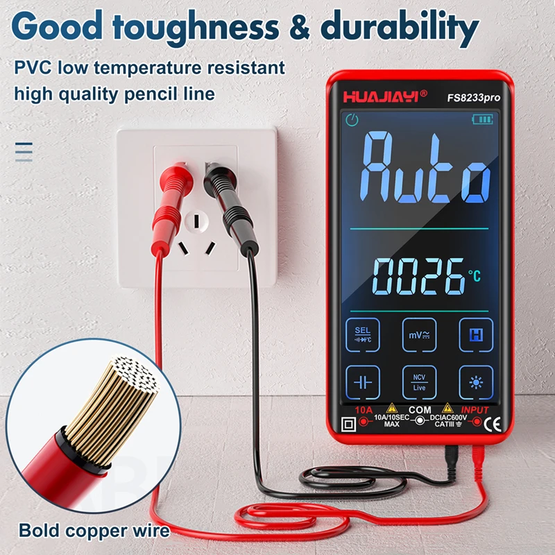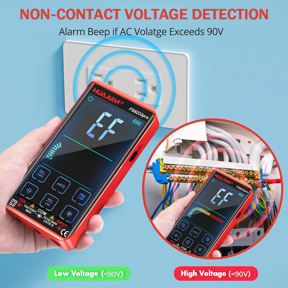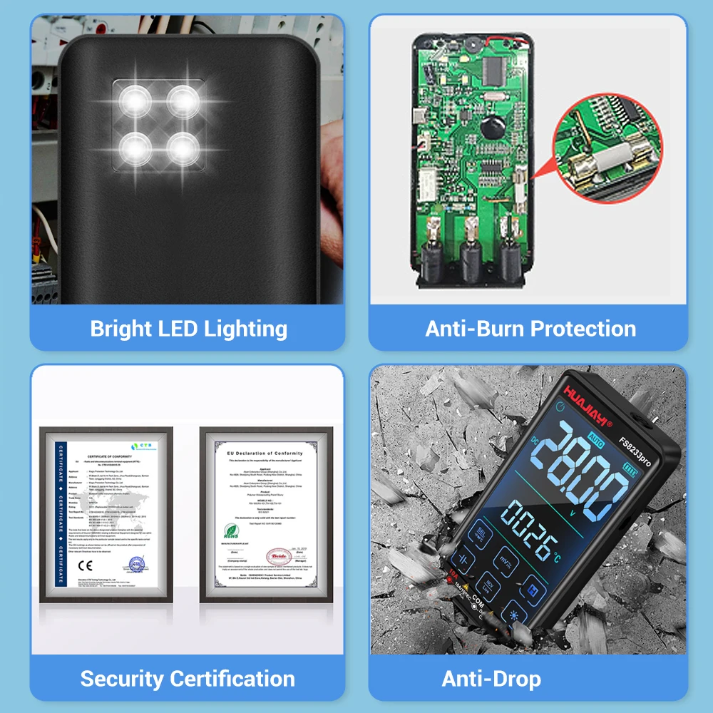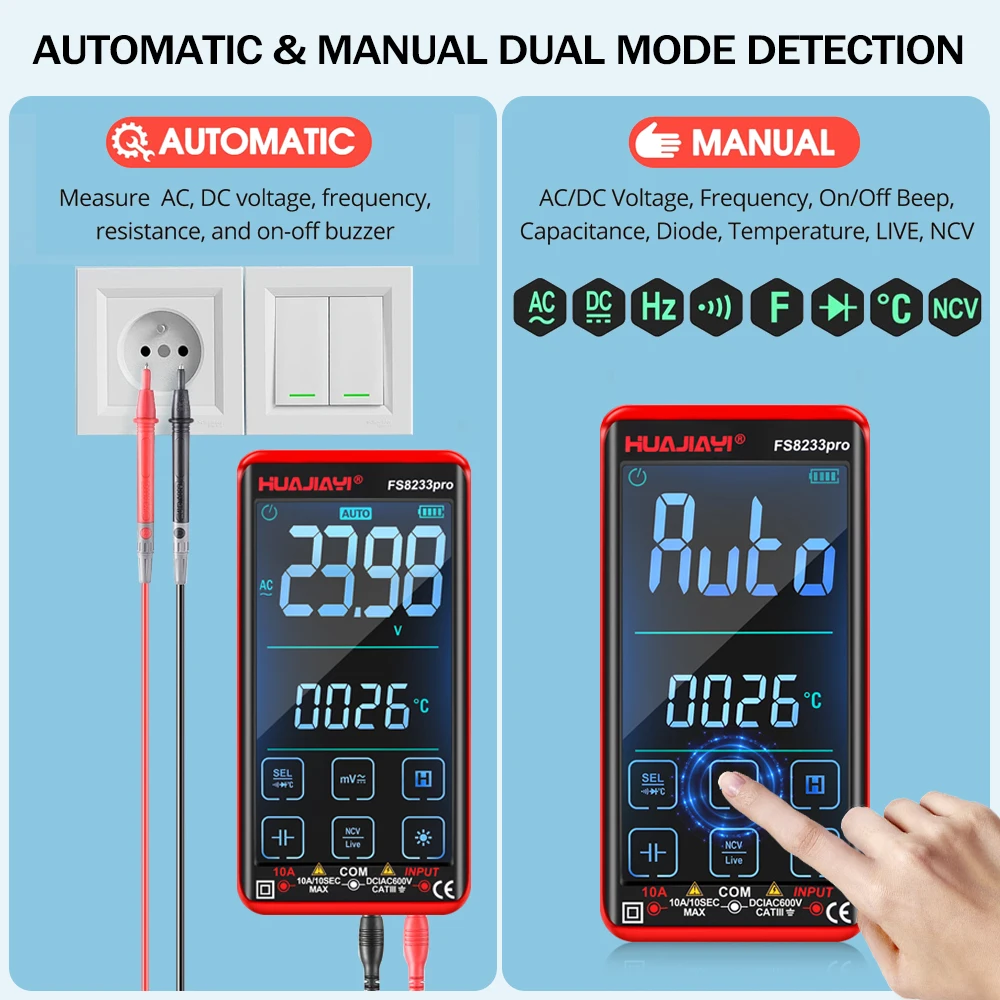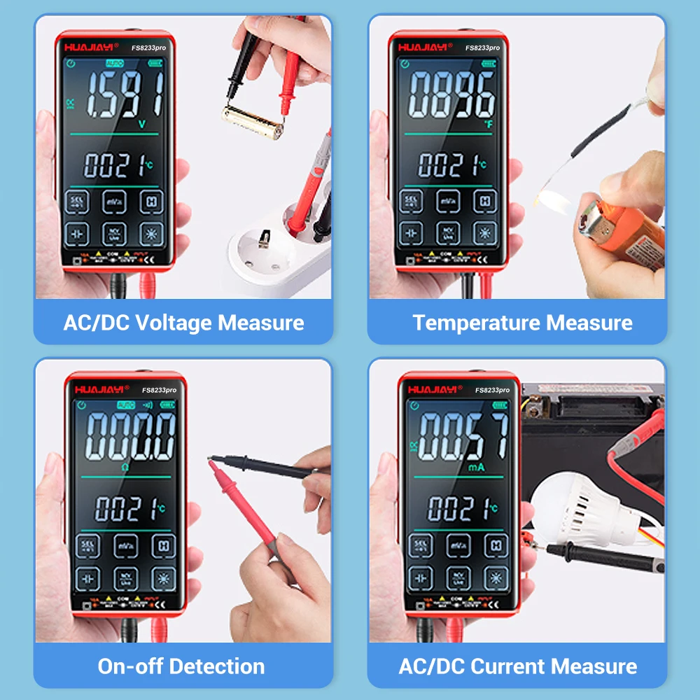 HUAJIAYI FS8233pro– портативный мультиметр с множеством функций измерения: АС/DS ток, АС/DS напряжение, сопротивление, емкость, температура, частота, непрерывность, проверка диодов и бесконтактное определение напряжения (NCV).