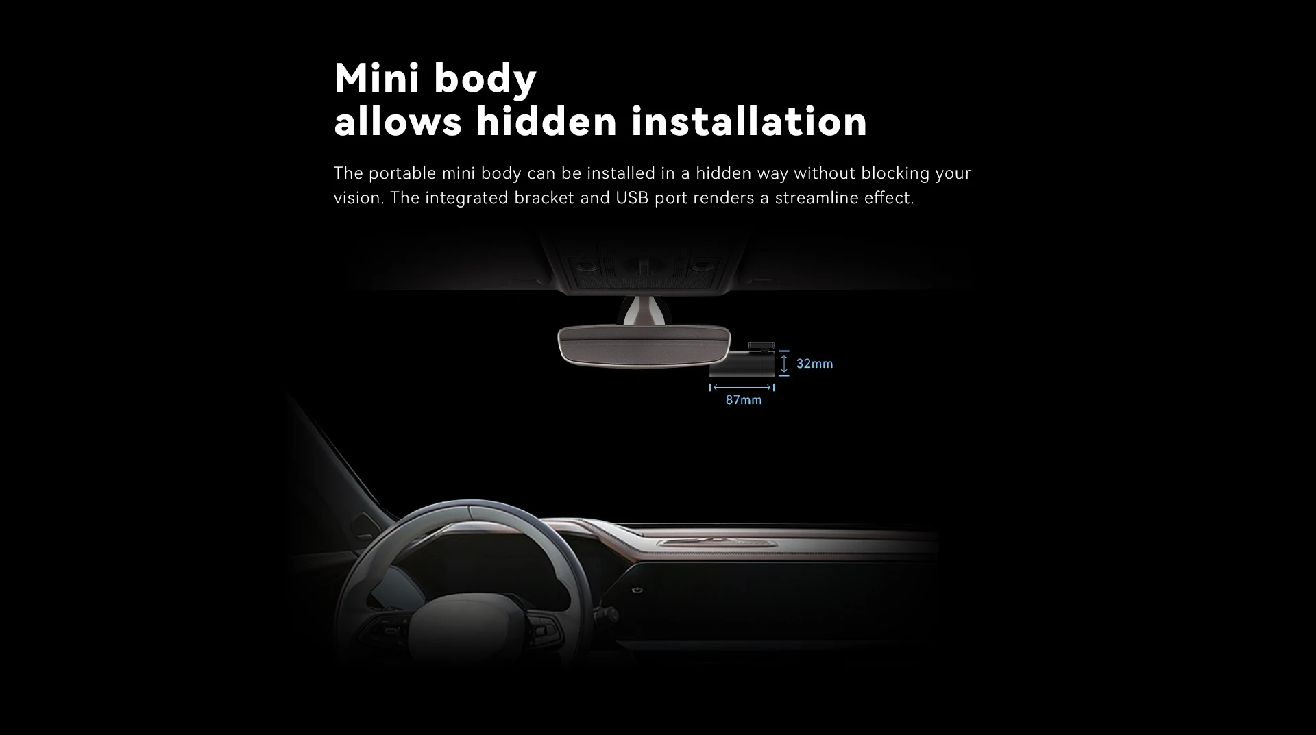 Размер видеорегистратора составляет всего 32 x 87 мм, благодаря чему он может быть установлен незаметно, не мешая обзору при движении. Использование интегрированного крепления и USB-порта придает устройству эстетический вид, идеально гармонирующий с интерьером салона автомобиля. Теперь вы можете наслаждаться полной защитой и записывать без помех!