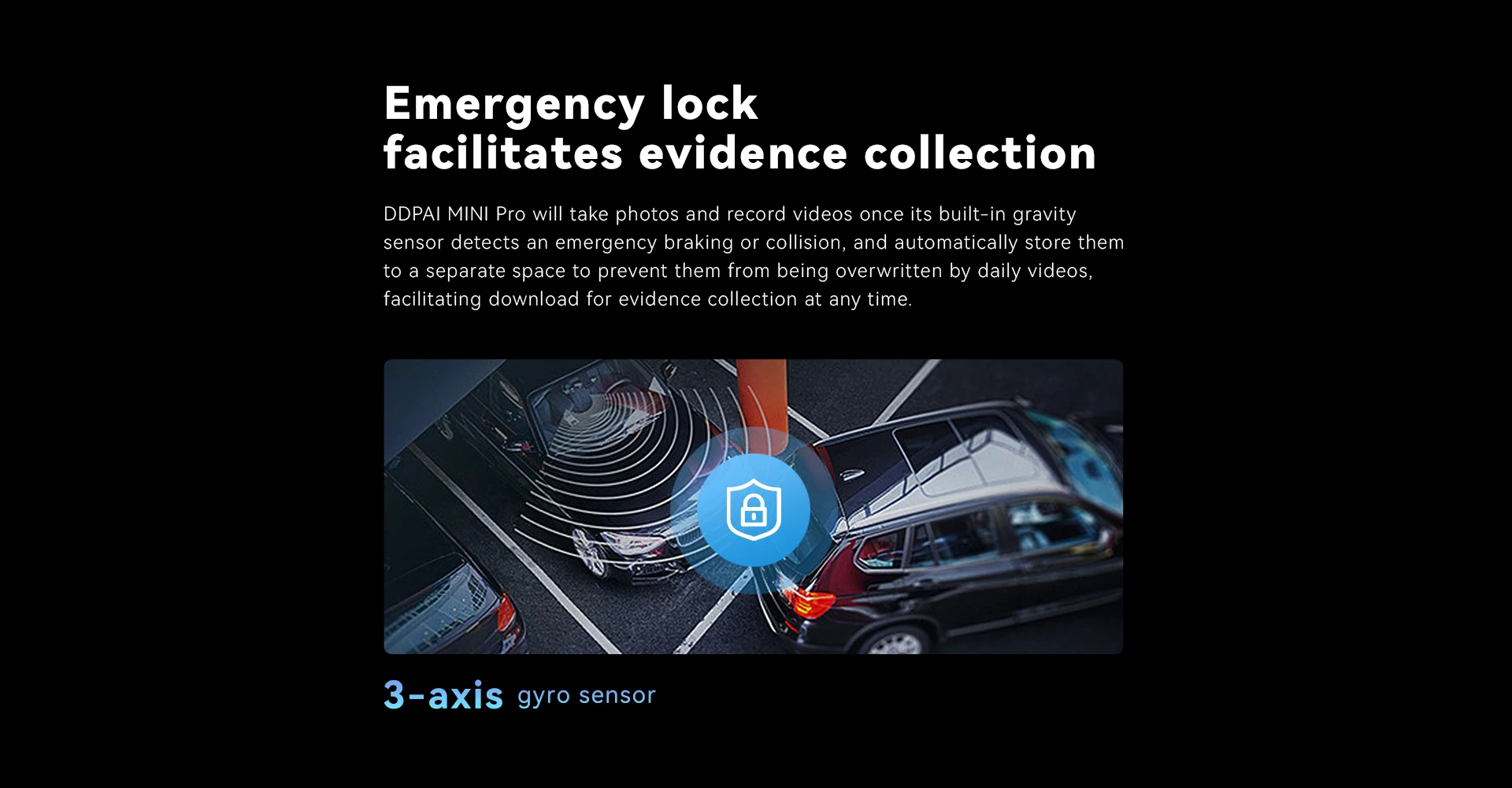 В случае чрезвычайной ситуации функция аварийной блокировки (emergency lock) облегчает сбор доказательств. Когда встроенный датчик гравитации обнаруживает резкое торможение из-за столкновения, видеорегистратор автоматически делает фото и видео и сохраняет их в отдельном месте, чтобы предотвратить их перезапись по повседневным записям. 3-осевой гироскоп дополнительно позволяет точно определять движение транспортного средства, обеспечивая еще большую точность записанной информации.