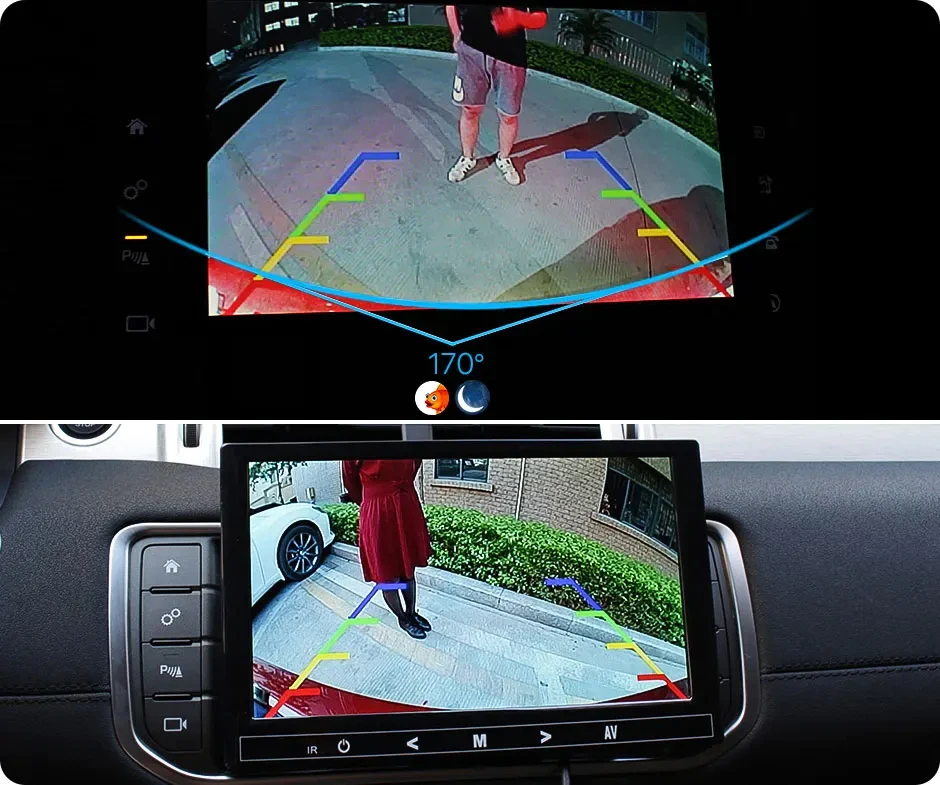 * Настоящий стеклянный объектив "рыбий глаз" 6, широкий угол обзора 170 градусов, отсутствие слепых зон, функция автоматической калибровки изображения для предотвращения сферическим изображением, что делает движение задним ходом более безопасным.