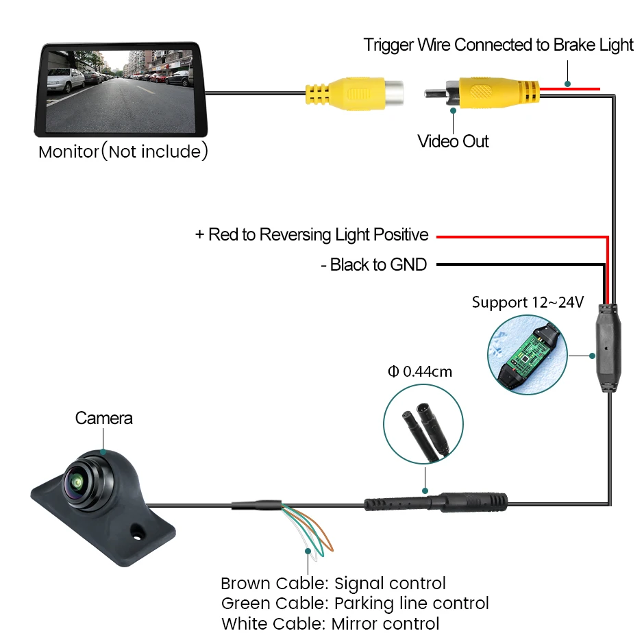 *Поддержка видеосигналов AHD и CVBS --- эту автомобильную камеру заднего вида можно использовать с мониторами AHD. Ее выходной видеосигнал по умолчанию имеет значение AHD1080P. Если вам нужно подключить монитор CVBS, пожалуйста, отрежьте коричневый кабель на камере и снова подключите источник питания.