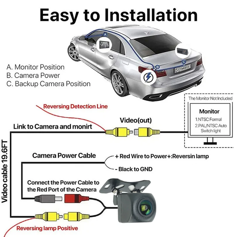 Камера для парковки является универсальной, поскольку имеет два способа подключения: (возможность включения и выключения парковочной разметки) и возможность изменить зеркальность для установки впереди автомобиля).