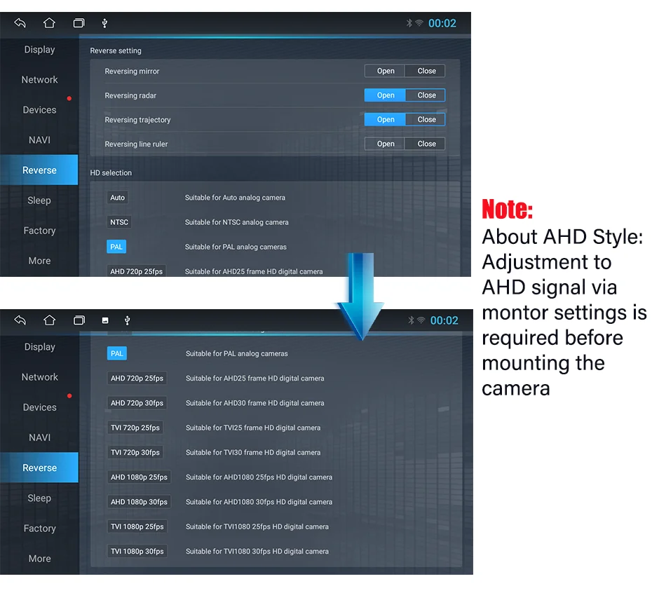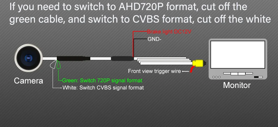В камере реализована возможность переключения между цифровым и аналоговым видеосигналом (с помощью петли на проводе камеры), что позволяет подключить к любому устройству с видеовходом RCA. Также камеры AHD менее чувствительны к помехам электропроводки автомобиля и в режиме AHD показывают более качественную и четкую картинку.