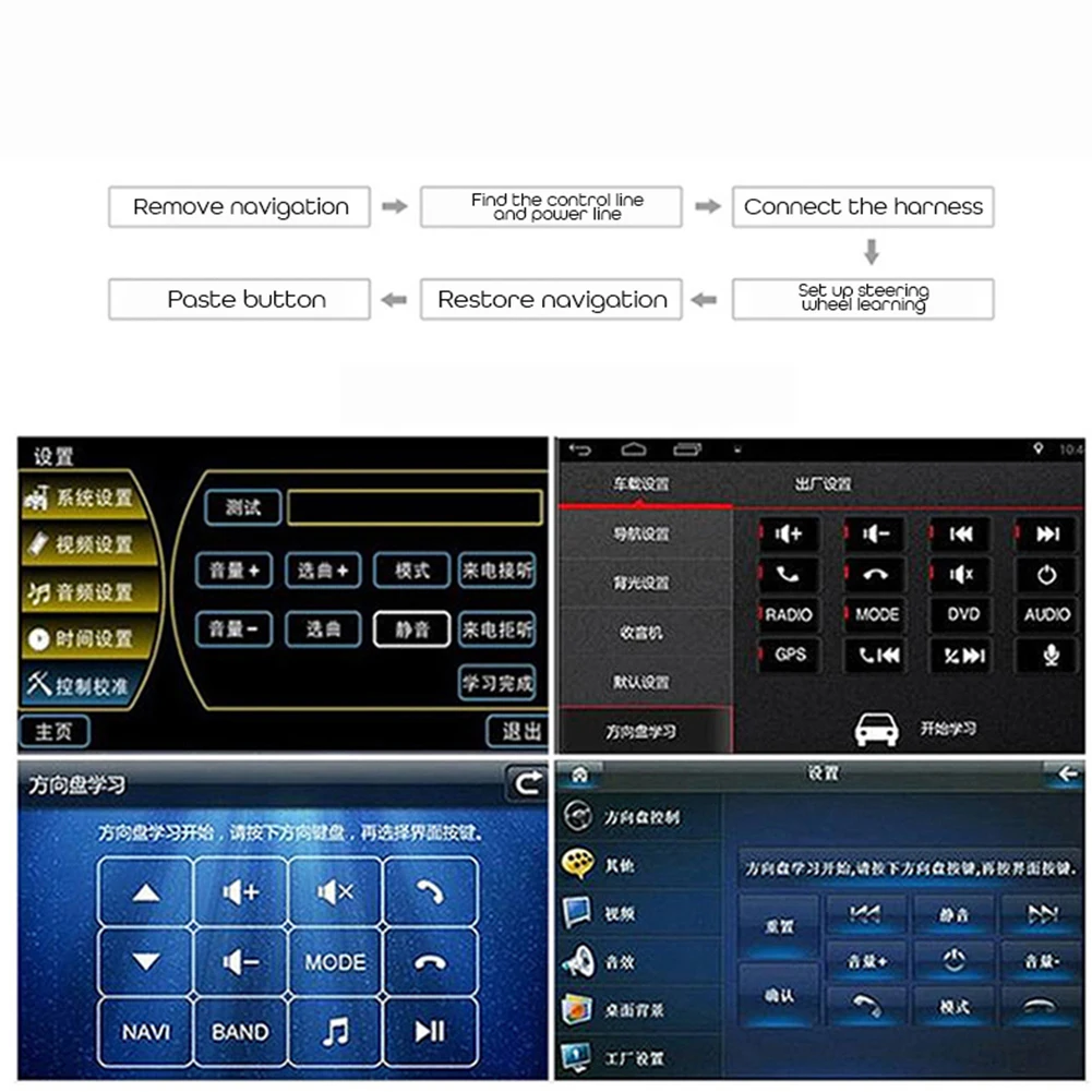 Спосіб монтажу простий, у комплекті йде дріт живлення й провід керування, провід живлення під'єднується до силового дроту живлення магнітоли він же (+) мінус таким самим способом до (-) живлення магнітоли, два інші key1 і key2 під'єднуються до дротів з аналогічним позначенням на магнітолі, якщо у вас комплектація магнітоли містить один дріт, тобто «key», то тоді два дроти від блока керування кнопками паралельно під'єднуються до одного дроту. Після під'єднання заходом у настроювання мультируля в магнітолі та програмується призначення кнопок.