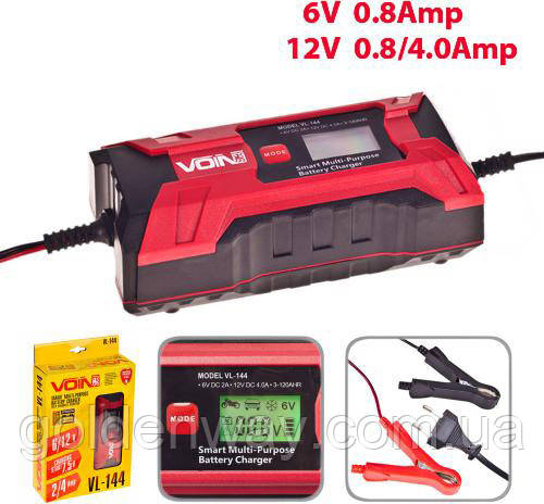 Інтелектуальний зарядний пристрій імпульсного типу VOIN VL-144 — це новітній пристрій для заряджання будь-яких різновидів акумуляторів. Ємність заряджуваної акумуляторної батареї може варіюватися в межах від 3 до 120 А/год. Номінальна напруга батареї 6 В/12 В. Перевагою цієї моделі є те, що є можливість ручного або автоматичного вибору сили струму, до 4 ампери. Усі необхідні дані видно на LCD-екрані.