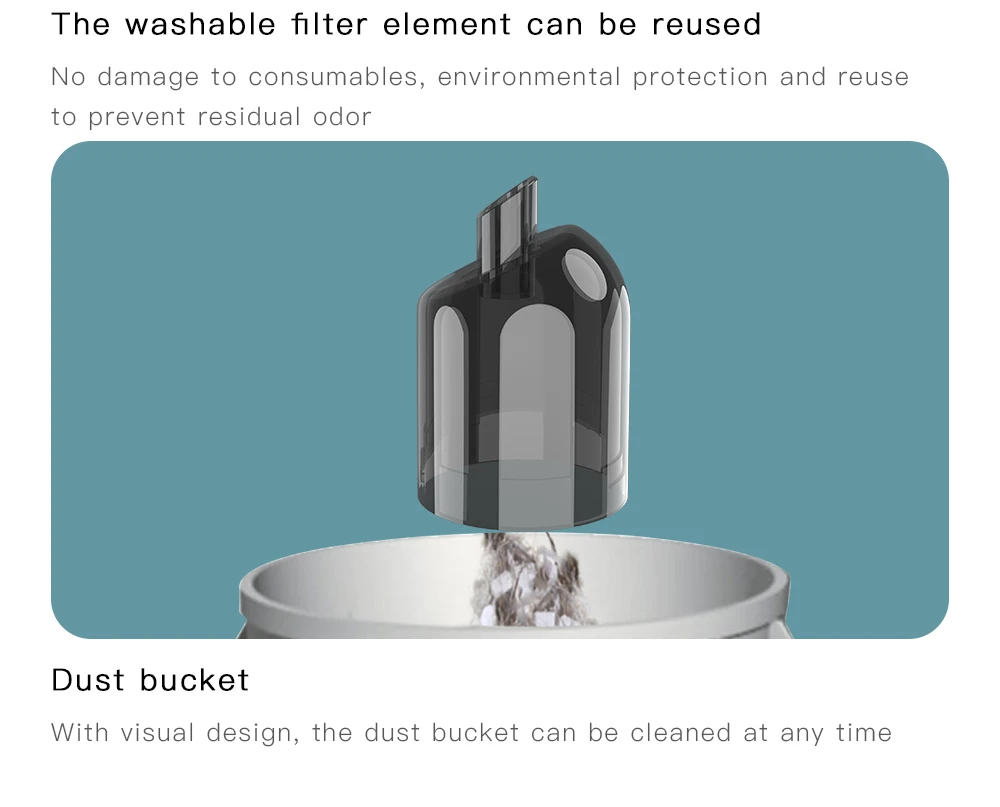 Спереду розміщується прозорий відсік для збору сміття (пилозбірник), який легко знімається й чиститься. Від циркуляції повітря з пилом рятує фільтр HEPA, який не дає змогу всмоктуваним частинкам потрапляти назад, а залишає їх у сміттєвому відсіку. Пилосос підтримує сухе та вакуумне прибирання. Завдяки максимальному вакуумному тиску 6000 Па досить пройти забрудненою ділянкою всього один-два рази до його повного очищення.