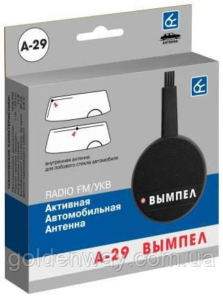 Вимпел А-29 — найпопулярніша автомобільна активна антена, яка кріпиться на лобове скло. Активна антена має впевнене приймання радіочастот у діапазонах FM/УКВ. Ця автомобільна антена має компактні розміри, виготовлена з якісного пластику, надійно приклеюється на лобове скло.