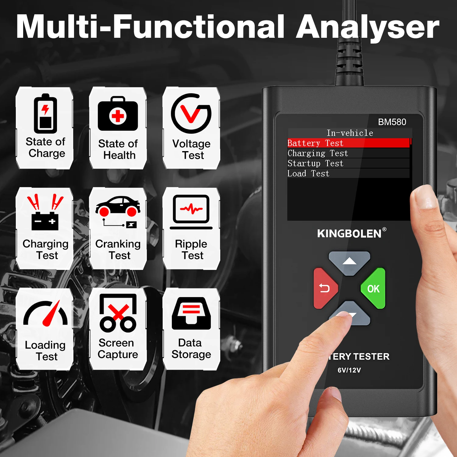 Тестер акумуляторів KINGBOLEN BM580 12V/6V здатен єфективно отримувати та аналізувати дані про стан акумулятора, а саме: напруга АКБ та рівень заряду, внутрішній опір, розрахований пусковий струм, та рівень зносу укумуляторної батареї.