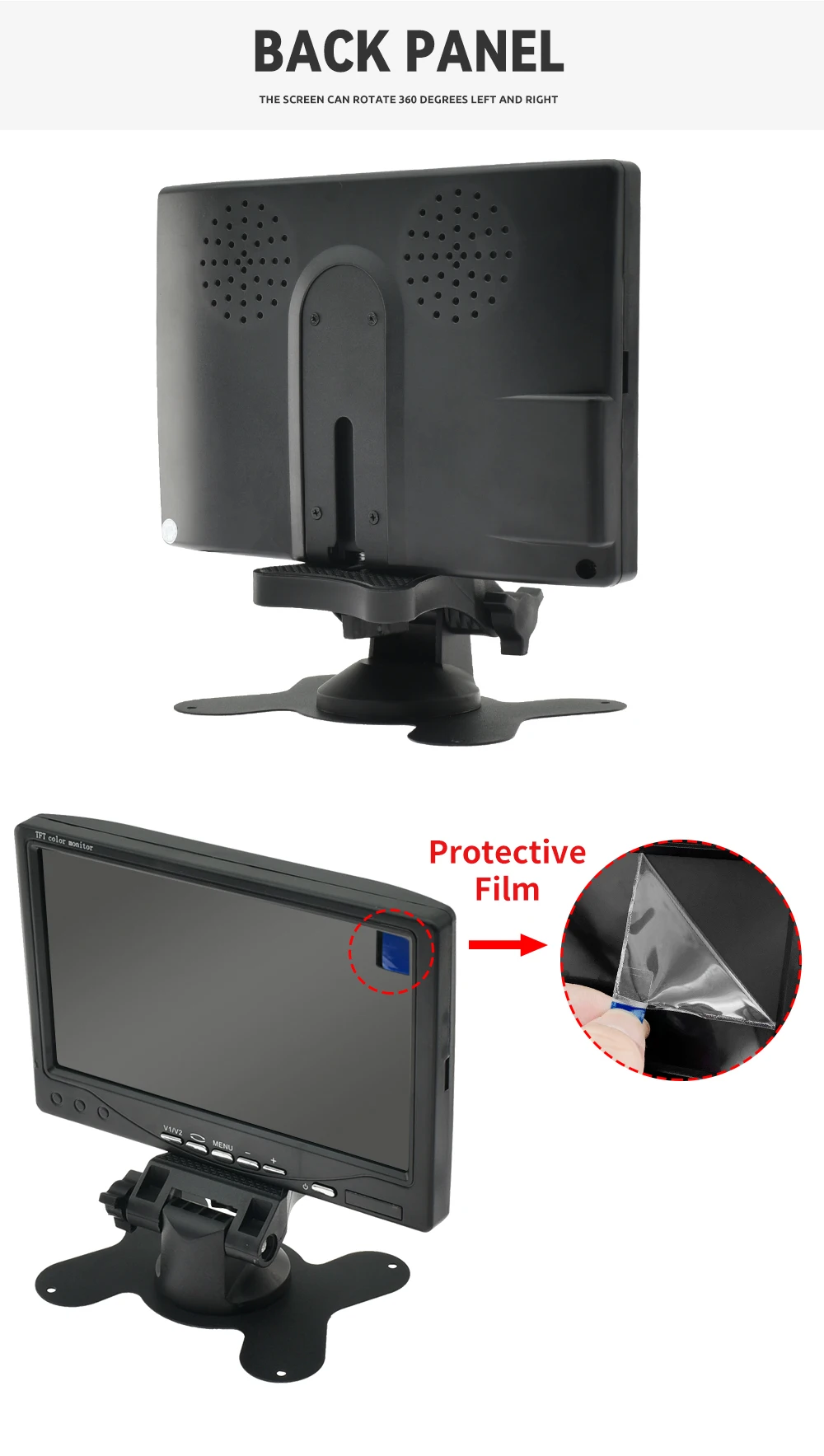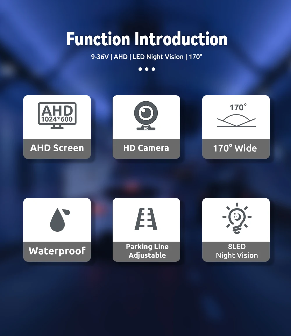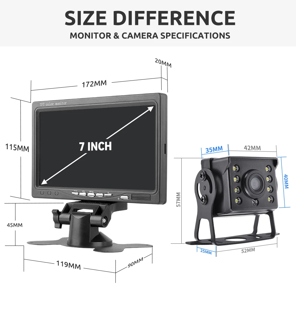 Комплект обладнаний яскравим екраном 7 дюймів, та камерою. Дуже простий у встановленні та не вимагає використання додаткових знань. Меню мультинаціональне й інтуїтивно зрозуміле навіть недосвідченим користувачам. Вся система універсальна та підійде для всіх різновидів транспорту, зокрема і спецтехніці.