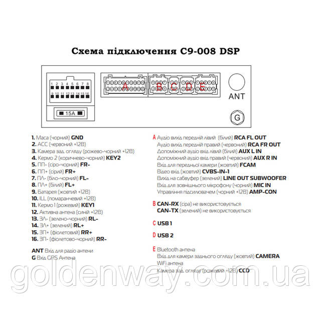 - Аудіовихід (2 канали) RCA -4 шт.(фронт-2/тил-2);