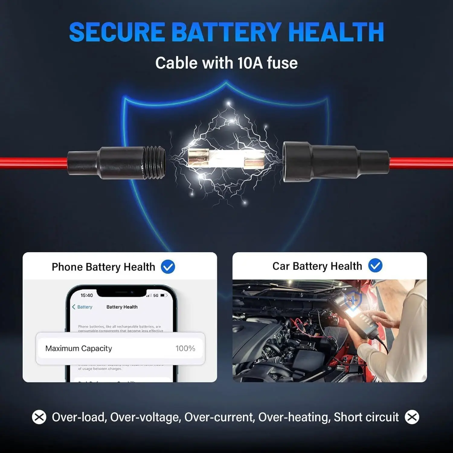 - Захист - Захист від перегріву, перевантаження по струму, перезаряджання, заряджання автоматично зупиняється, коли акумулятор повністю заряджений; простий у використанні та встановленні.