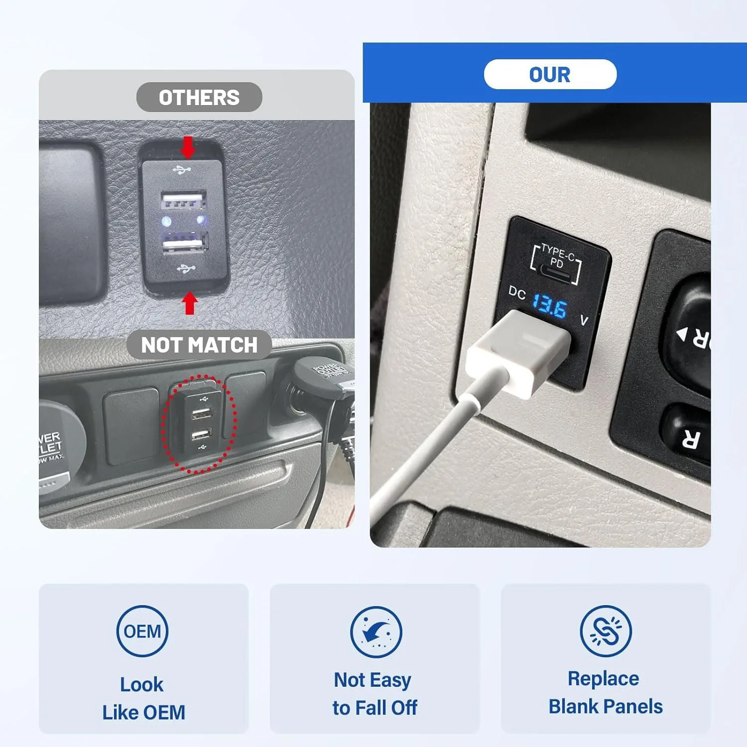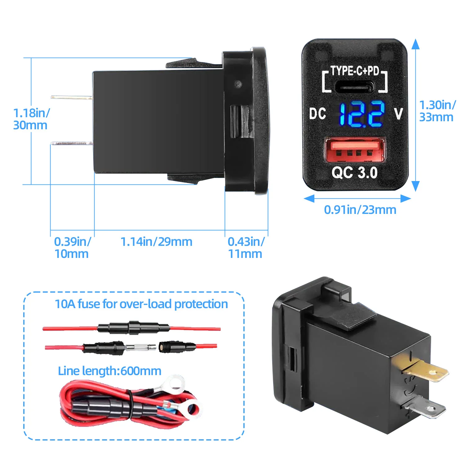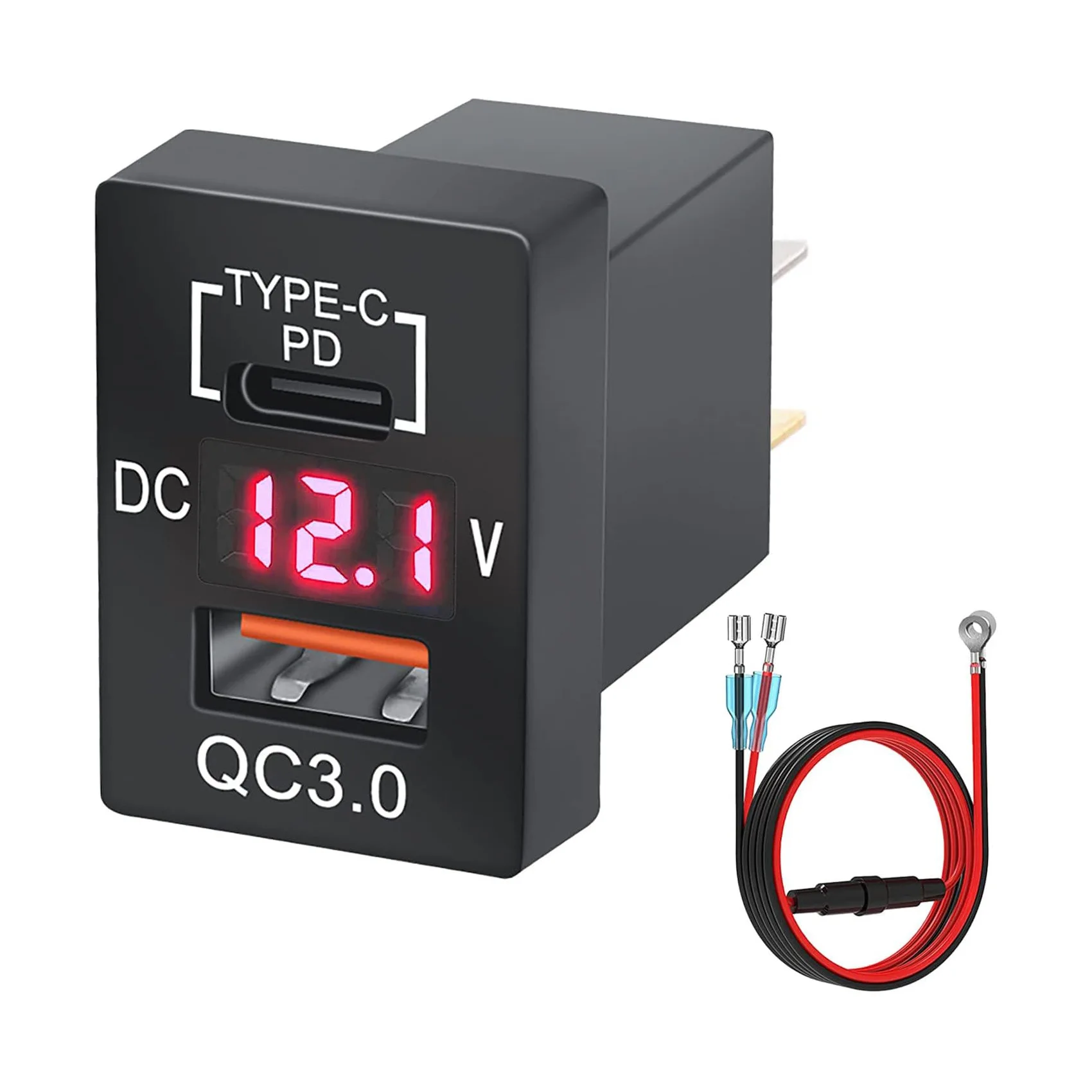 Автомобільне зарядне гніздо врізна розетка з вольтметром АЗП Toyota 33х23мм швидка зарядка USB QC3.0+PD Type C 48Вт СИНІЙ