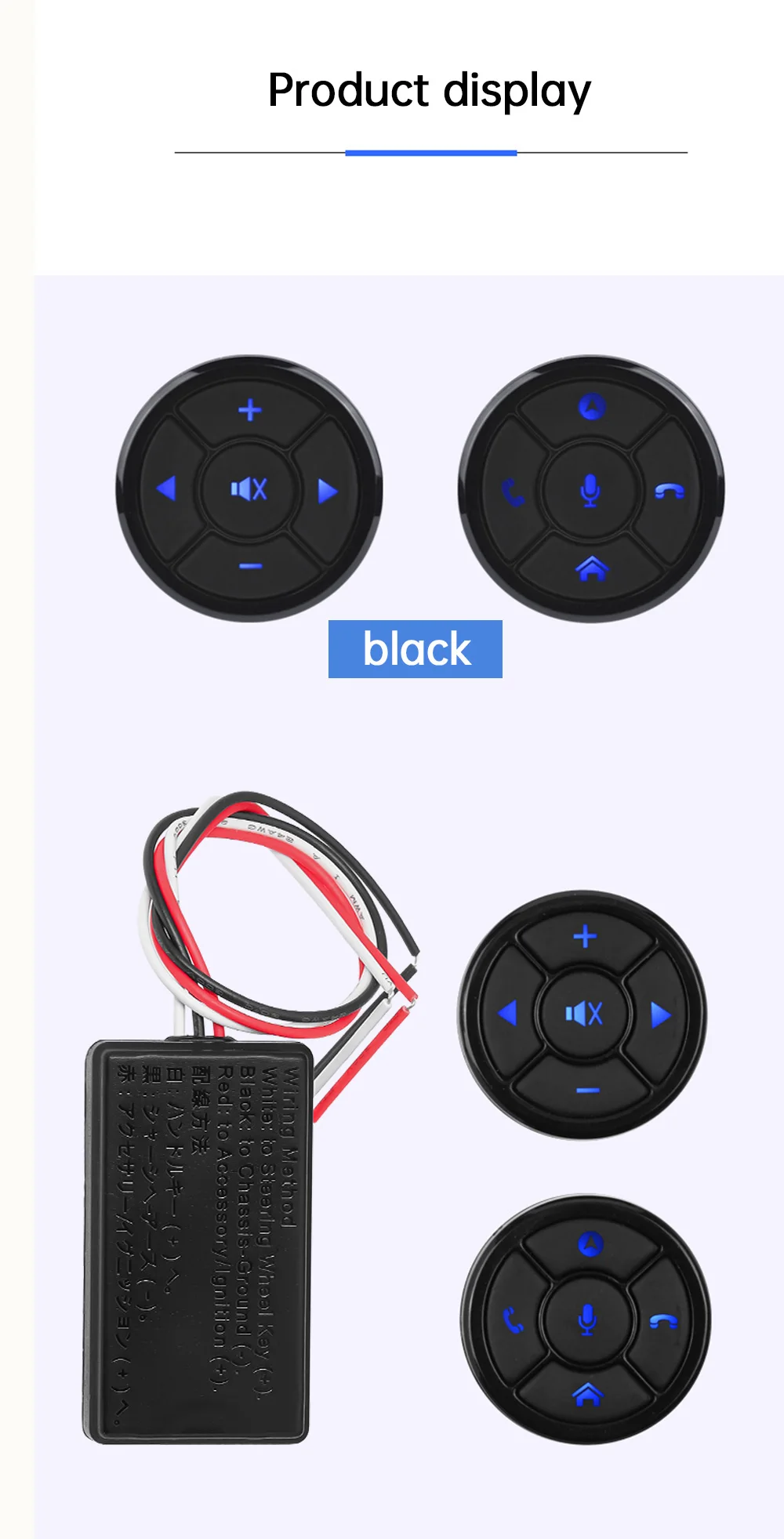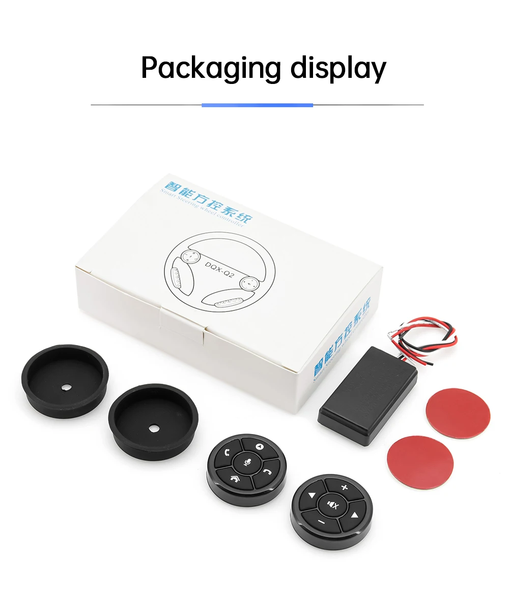 Кнопки на кермо для керування будь-якою магнітолою зі стандартним резистивним інтерфейсом мультируля. Складається з двох бездротових блоків кнопок, що закріплюються на будь-яке кермо, навіть під обплетення, і приймального радіомодуля, що під'єднується до автомагнітоли та живиться від бортової мережі автомобіля. Бездротові кнопки живляться від літієвих батарей CR2032 — по одній у кожній. Після під'єднання необхідно зайти в параметри вашої магнітоли, вибрати пункт навчання кнопок (Steering Wheel) і присвоїти кожній кнопці потрібні функції, зберігши їх після закінчення налаштувань.