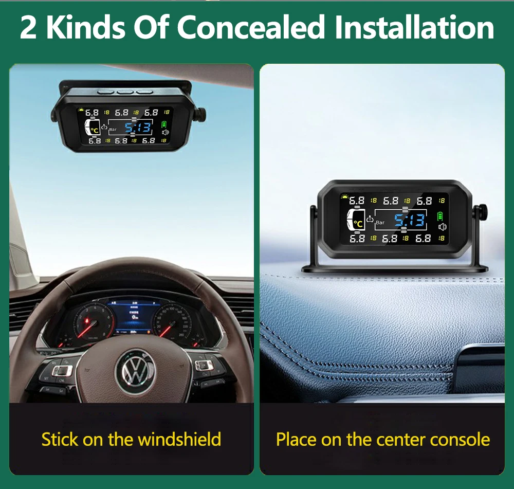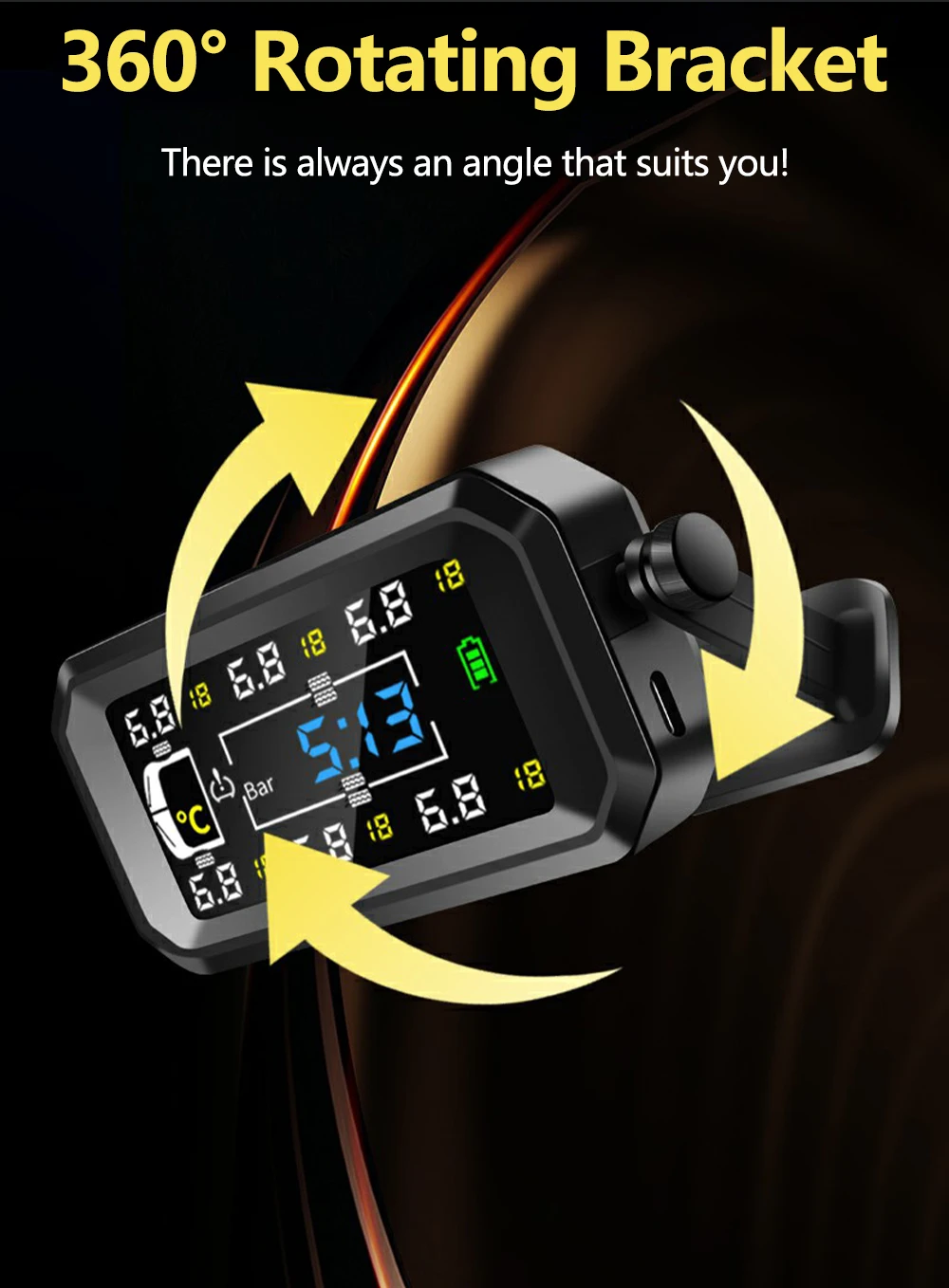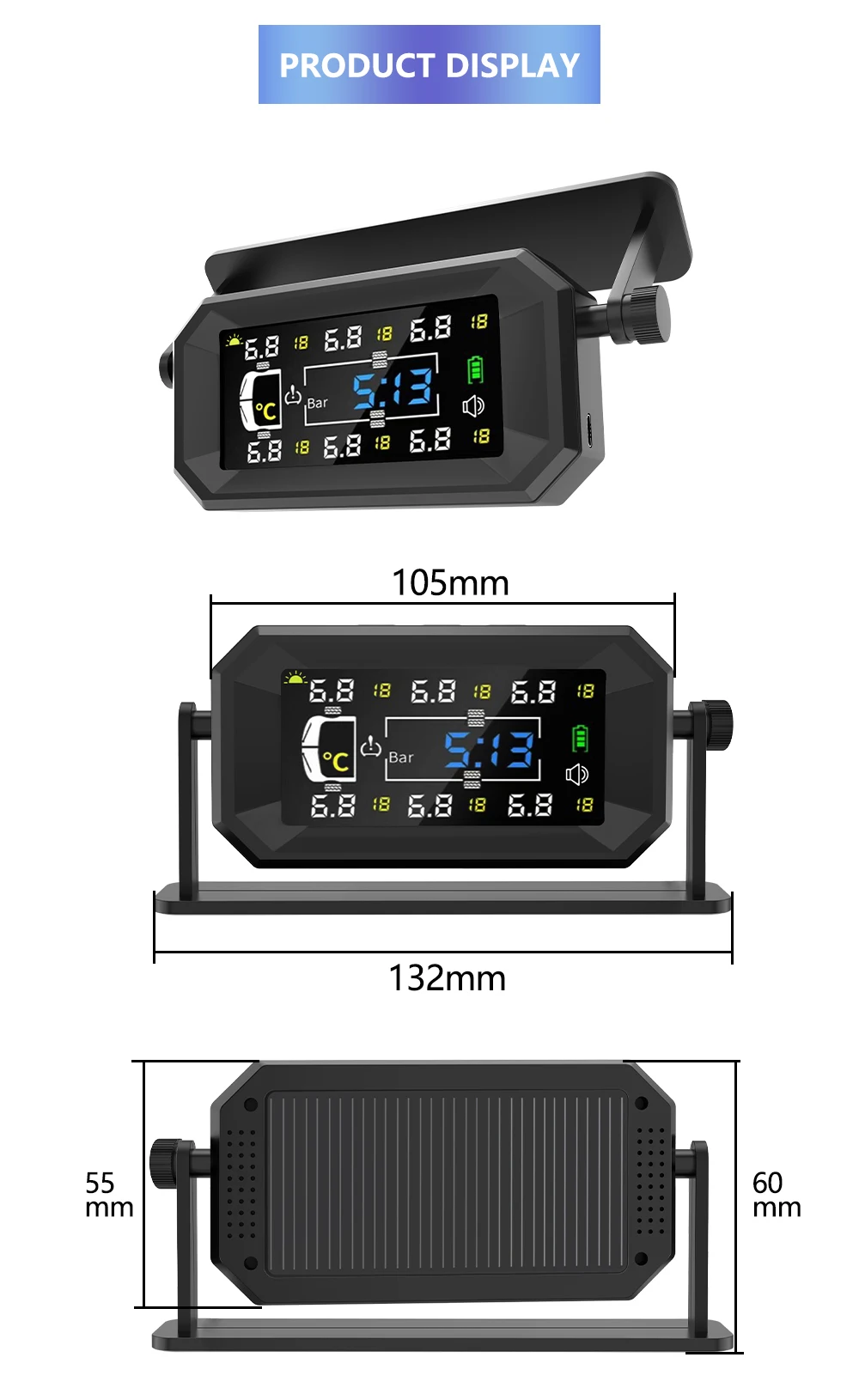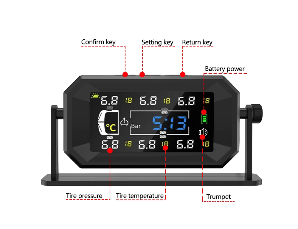 Цифровий дисплей: РК-екран із яскравою підсвіткою і чіткими даними дає змогу легко читається, він також обладнаний регульованим кронштейном, яким можна регулювати зображення тиску в шинах відповідно до нахилу приладової панелі.