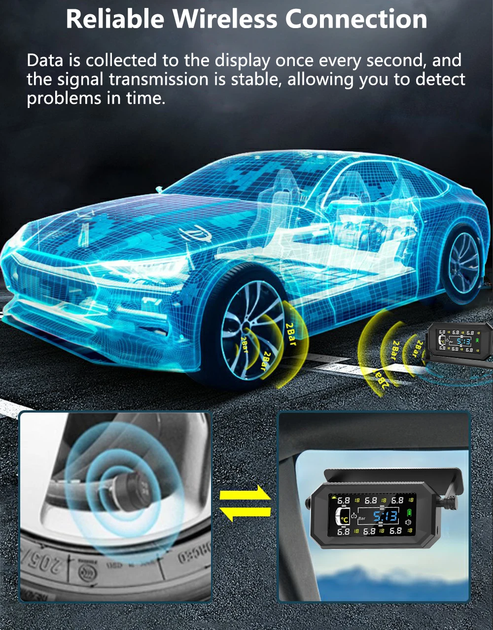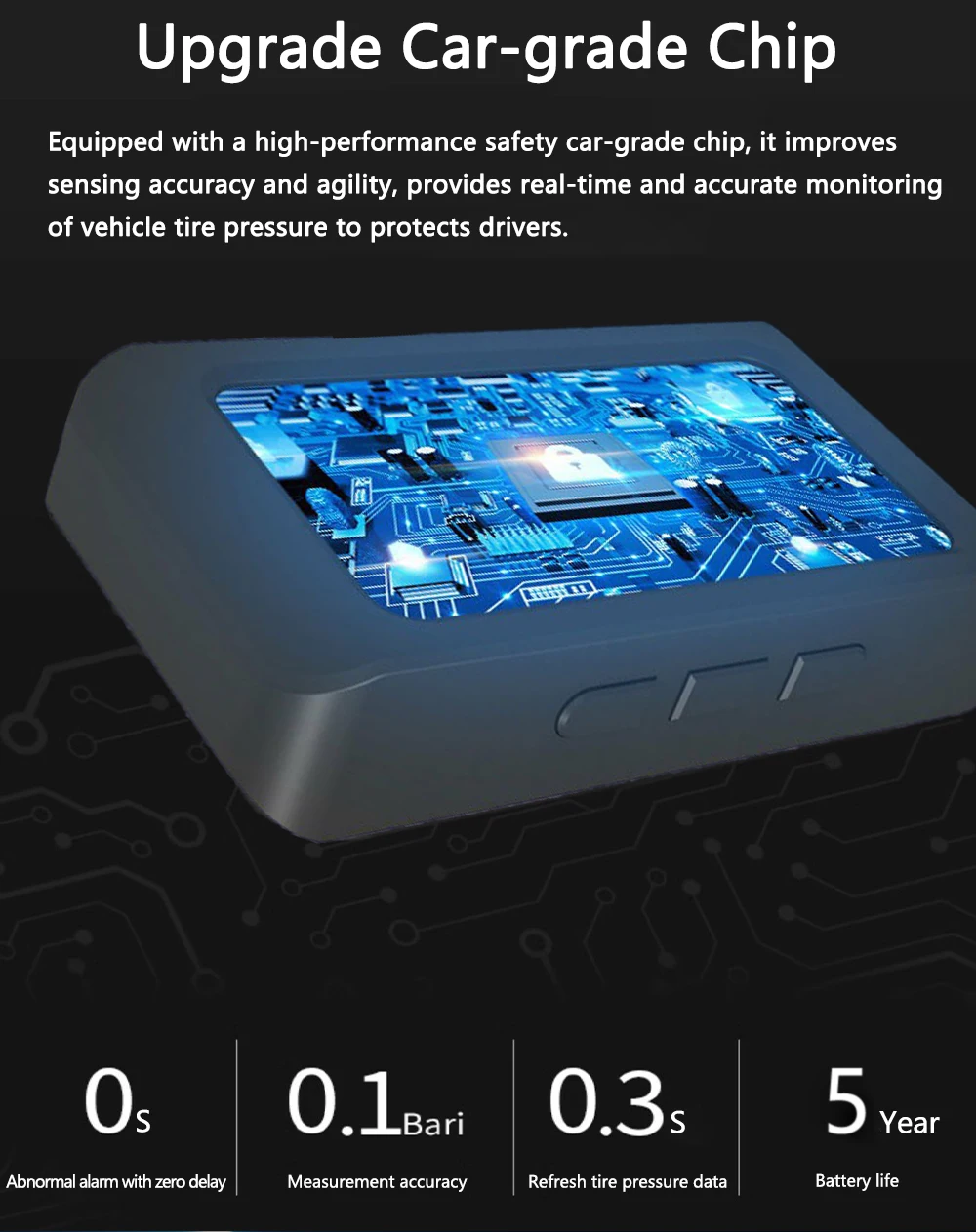 Оснащений високопродуктивним чіпом безпеки автомобільного класу, він покращує точність і маневреність датчиків, забезпечує точний моніторинг тиску в шинах автомобіля в режимі реального часу для захисту водіїв.