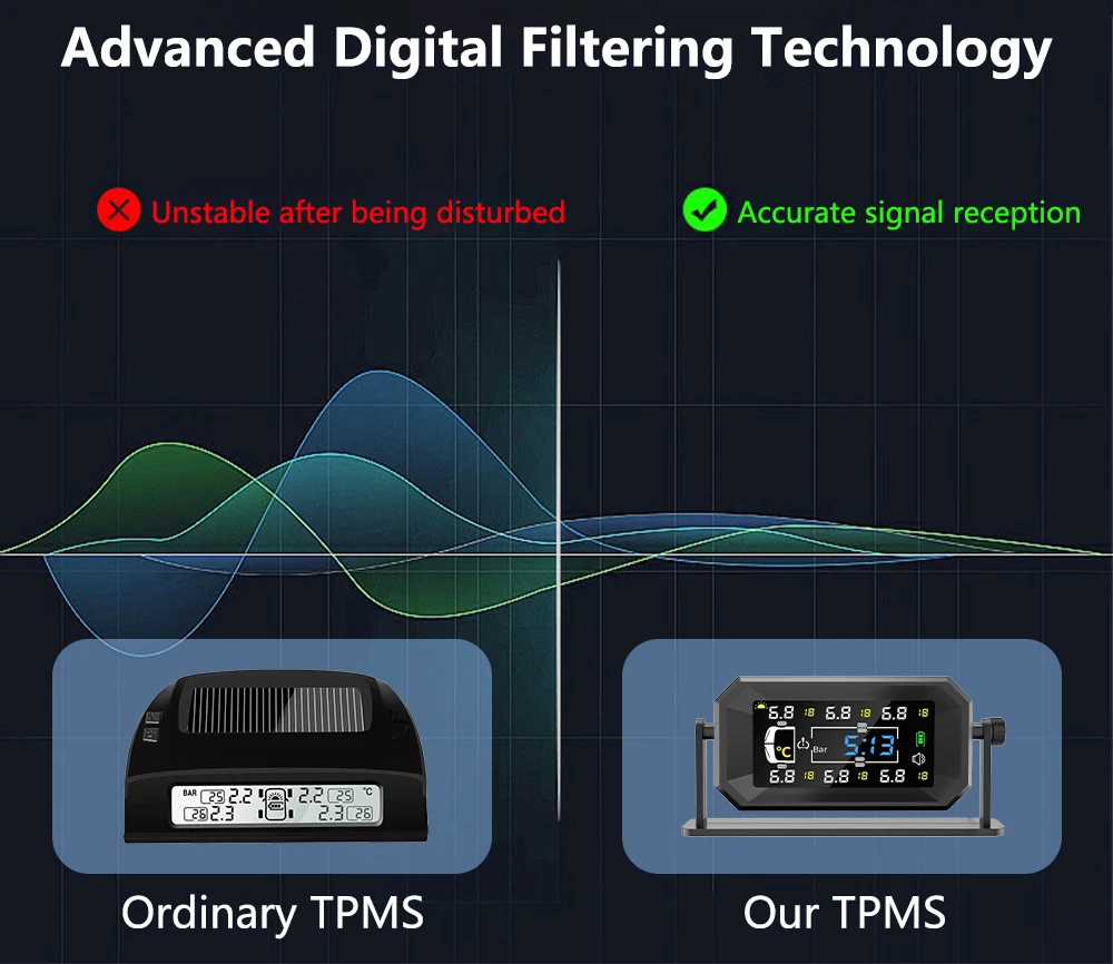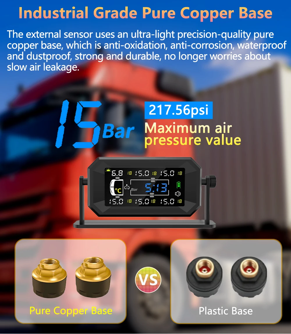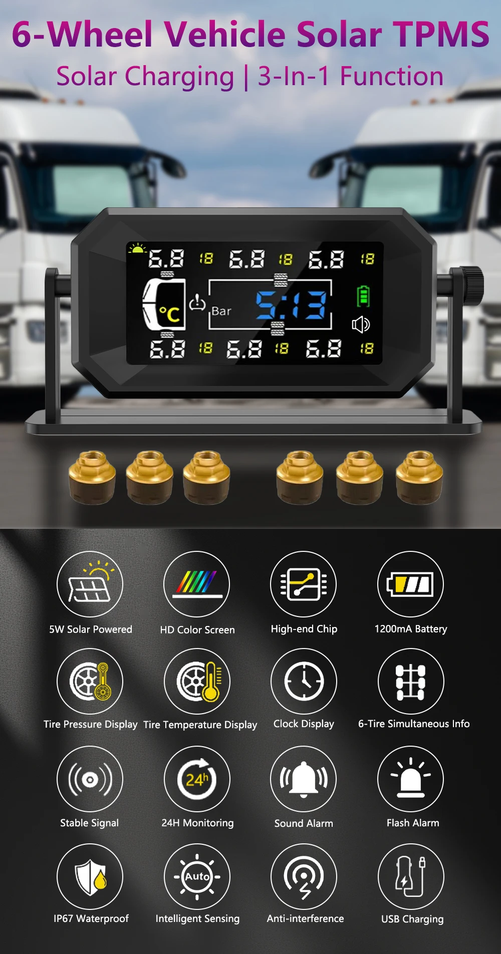 Цей 6-колісний TPMS зі стабільним підключенням та діапазоном вимірювання тиску до 15 бар (217,56 фунтів на квадратний дюйм), спеціально розроблений для великих 6-колісних транспортних засобів, забезпечує стабільний моніторинг для будинків на колесах, автофургонів, причепів, вантажівок та напівпричепів.