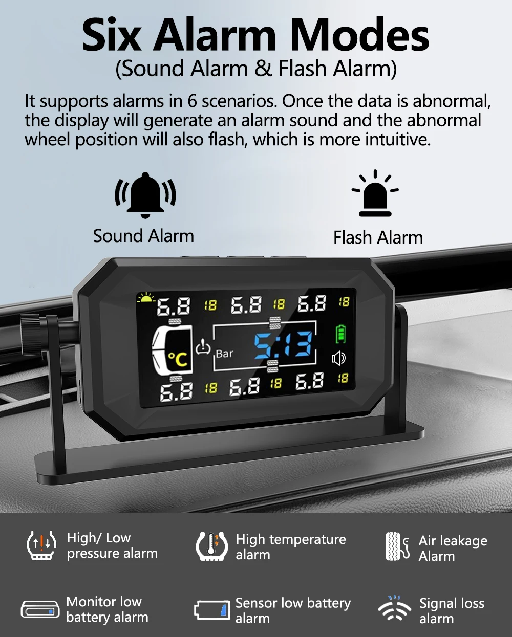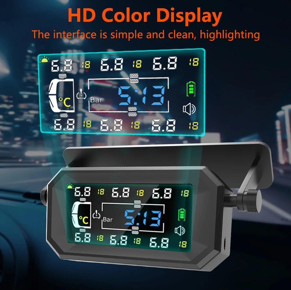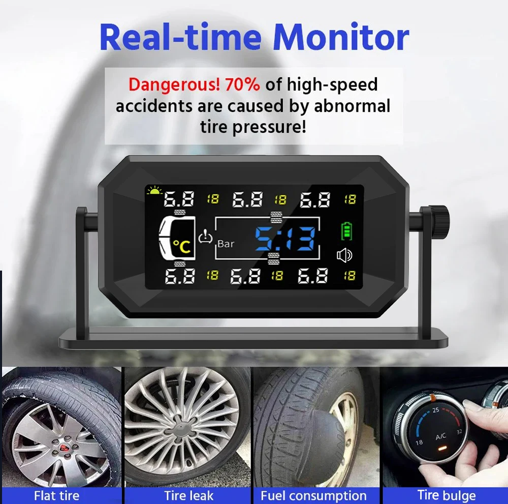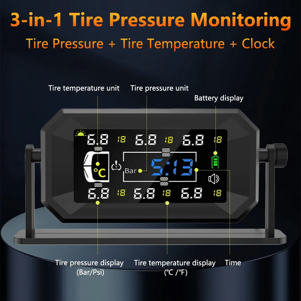Підходить для 6 шин: максимальний тиск у шинах становить менш ніж 8 барів, моніторинг температури та тиску в реальному часі з високою точністю для 6 шин одночасно та може автоматично змінювати відповідні дані, режим РК-дисплея забезпечує висока роздільна здатність.