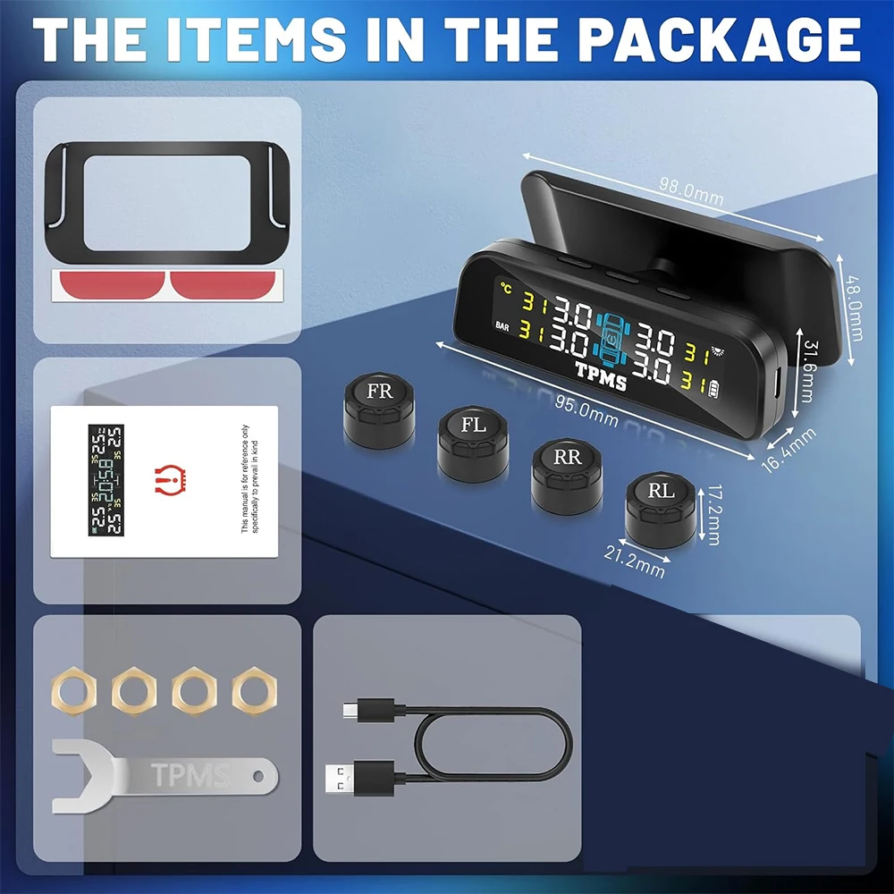 Сонячне заряджання і через USB: інтелектуальна бездротова система з 2 способами заряджання, які забезпечують безперервну роботу системи контролю тиску в шинах, що перезаряджається літієва батарея.
